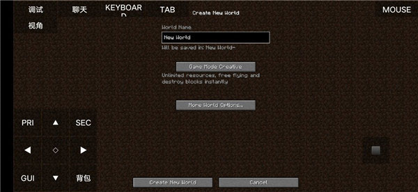 7、进入此界面后选择你的游戏模式以及名称并点击下方的create new world”;