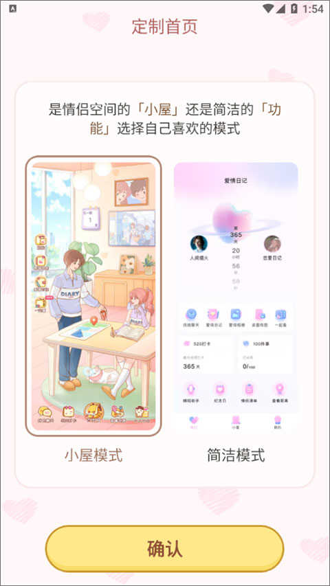 2、情侣匹配成功后,双方可以自由定制选择首页样式,拥有情侣空间的小屋模式”和简洁的功能模式”,选择自己喜欢的模式点击确认”即可;