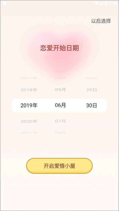 3、选择模式之后我们还可以选择情侣的恋爱开始日期,选择完成点击开启爱情小屋”即可,当然也可以点击以后选择”跳过;