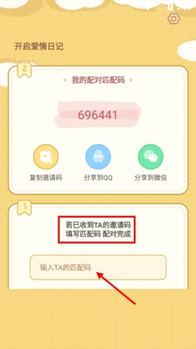 1、通过本站下载并安装爱情日记app,想要进入软件需要情侣双方注册账号,其中一方输入对方的配对匹配码即可;