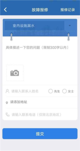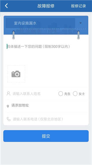 报修流程:点击故障报修”→填写问题描述→上传照片→提交后等待回访。