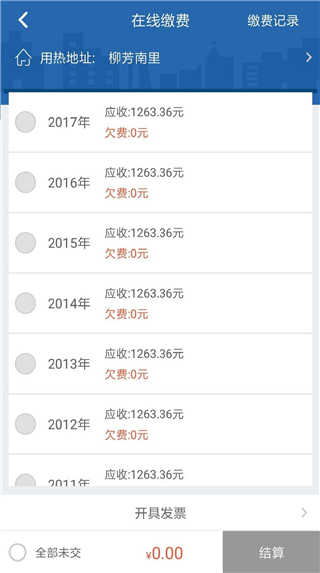 4、在线缴费页面中,选择相应年份您需要交的供暖费后,点击结算进行缴费;