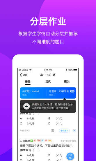 1、基于精准的数据分析,软件可帮助教师深入掌握学生学习状态,识别知识薄弱环节,并提供个性化辅导建议。