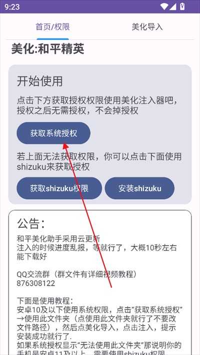 1、进入首页后需要先获取系统授权,也可以点击获取shizuku权限。