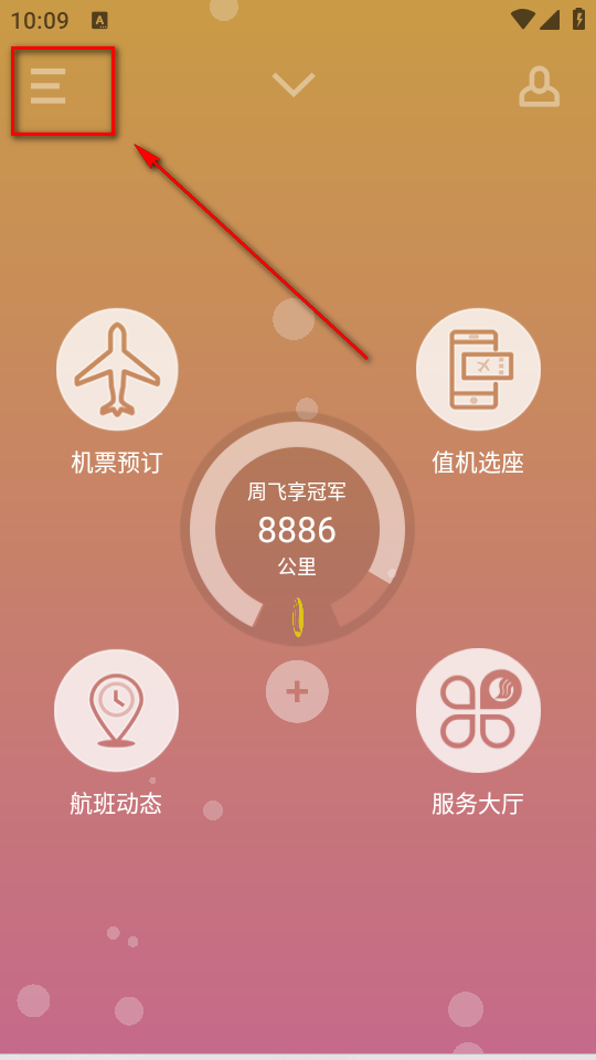 1、进入手机上的山航掌尚飞app后,点击左上角【三图标】。