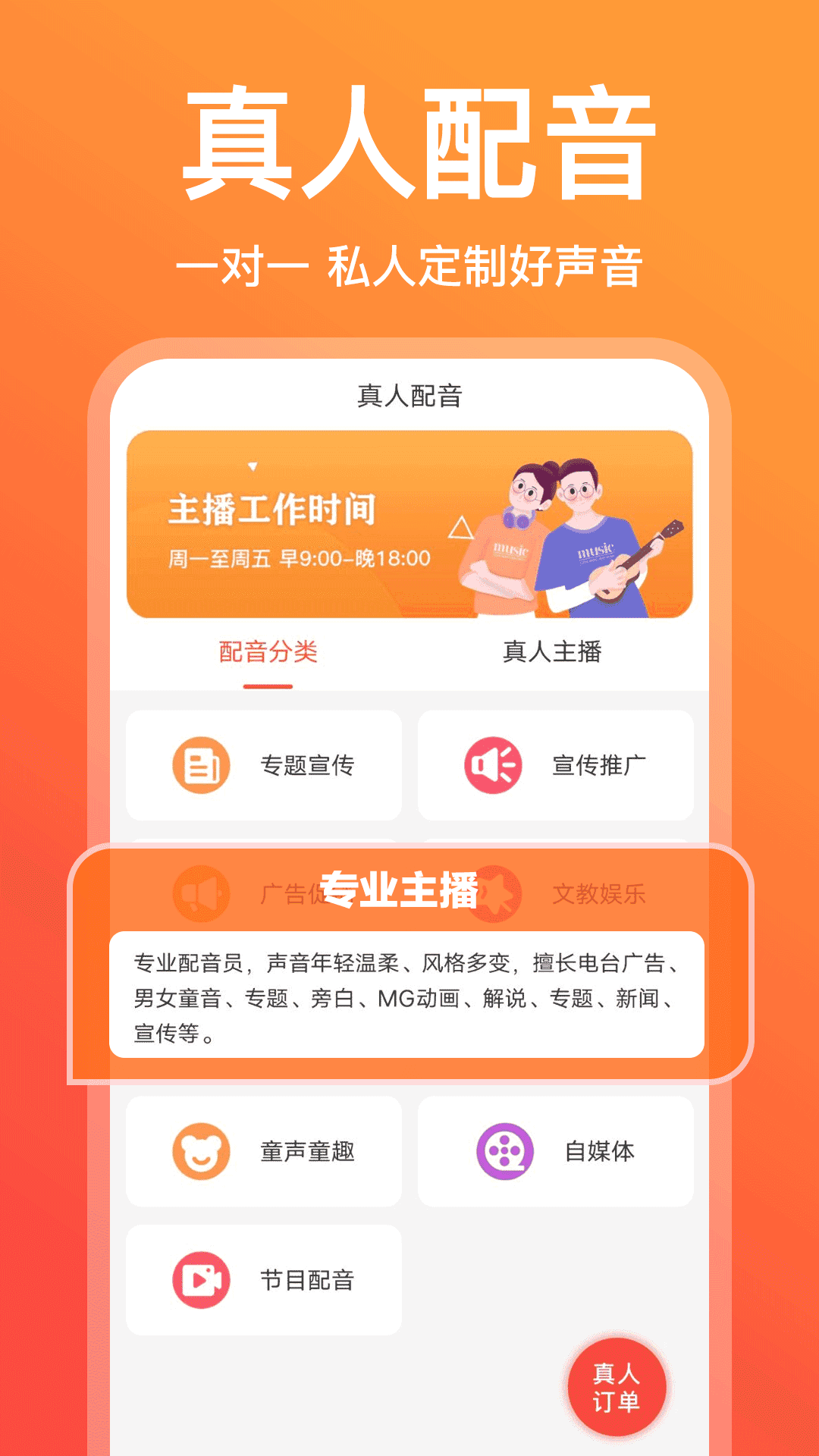 1、广告配音:商场广告促销、地摊叫卖、企业宣传、影视配音等。