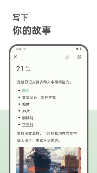 图文混排编辑: 用户可以使用简单好用的图片混排功能,让日记更具视觉冲击力。