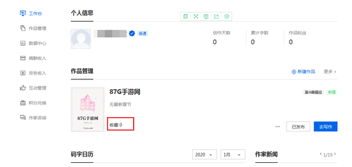 2、进入工作台”后,在作品管理”中即可查看收藏情况。