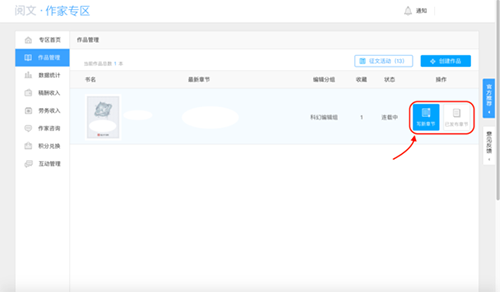 3、选择要签约的作品,点击写新章节”或已发布章节”;