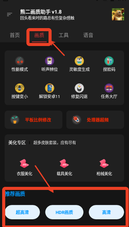 2、点击画质”按钮,即可从下方选项中选择所需的画质模式。