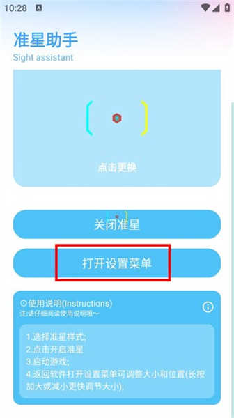 5. 返回应用,点击打开设置菜单”,即可根据个人习惯对准星大小和位置进行个性化设定。
