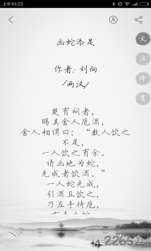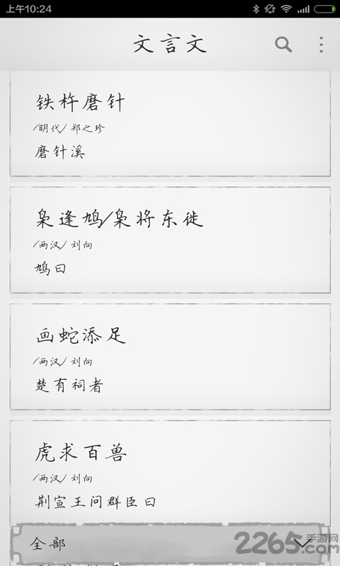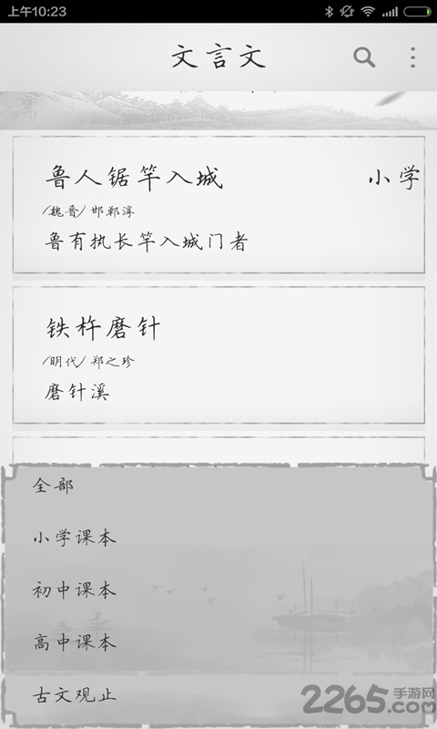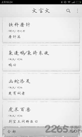古诗词典深受2265用户喜欢,是老师、家长和学生的良师益友,学习考试的必备神器。文言文全面覆盖了小学,初中,高中的教材内容,简单明了的注解译文,典雅的视觉风格,方便你按阶段进行学习理解和背诵。其次,文言文收录了古文观止这部经典之作的文言文内容,是市面上古文内容甚全的app。