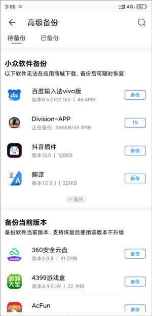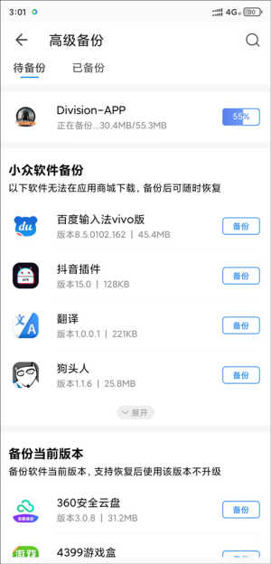 3、所有待备份软件的右侧都有一项备份”,单击以后就开始备份了,而且应用还自动将小众软件单独列出来;