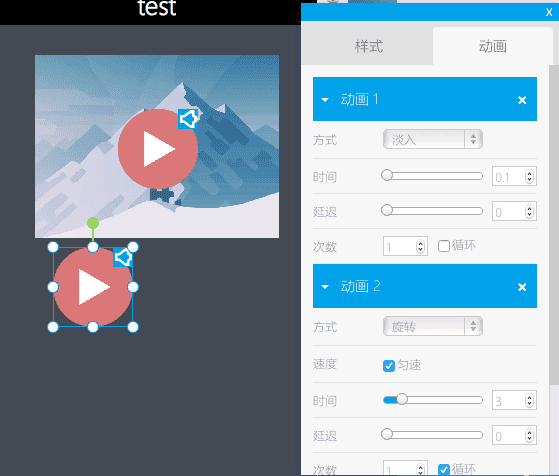 为第二个播放按钮添加动作,使它快速出现并旋转