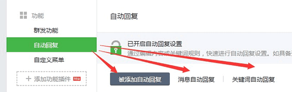 如果你熟悉官方平台操作,你还可以使用自动回复的功能来推送场景:添加新粉丝时自动回复推送场景、消息自动回复场景、按关键词自动回复场景。这三个方式,订阅号、服务号均可。