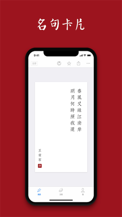 * 名句卡片:精选数千条诗词名句,卡片式切换