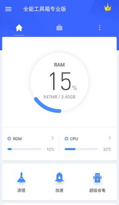 进入全能工具箱专业版主界面后,用户可第一时间查看设备的整体运行情况,例如内存占用、CPU温度以及剩余存储容量等关键信息。