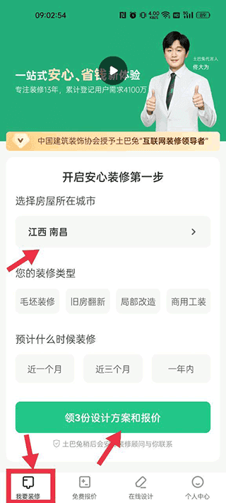 点击左下角的我要装修”选项,输入所在城市并选择相关需求后,即可免费获取专业的装修设计图纸。