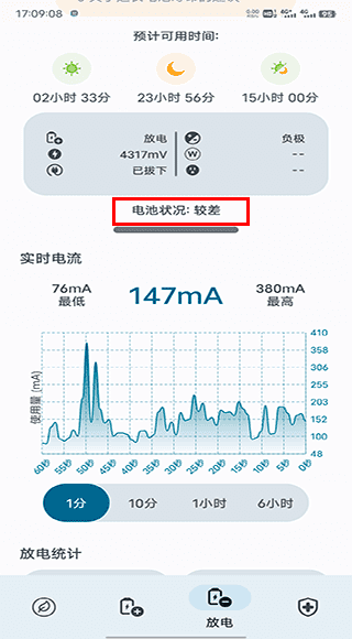 3、另外你还可以在放电”页面查看电池状况及实时电流输出;