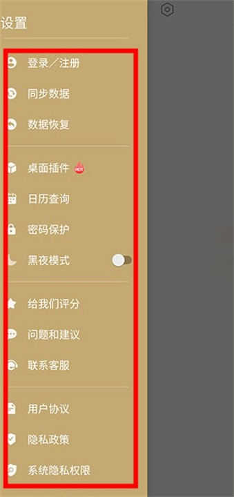 3、在此界面可启用数据同步、桌面小部件、日历查看、加密保护及夜间模式等功能。