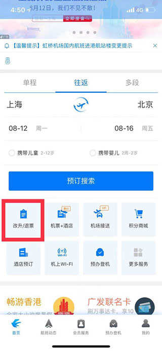 1、打开东航官方版APP,在首页点击改升/退票”选项。