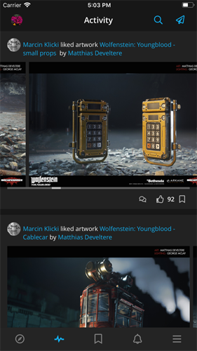 打开 ArtStation 就可以看到一整屏的 CG 作品,点击图片可以查看大图,登录后可以 follow 作者,对作品评论点赞。点右上角可以对作品进行分享、保存。点左下角可以查看作品的详情。