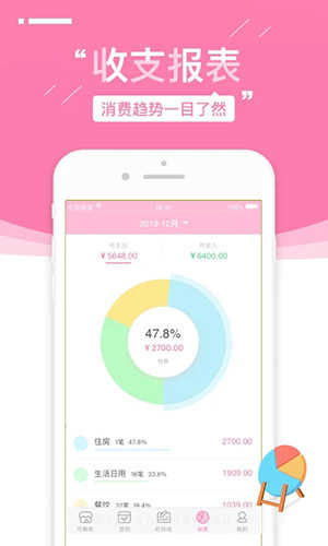 ·智能统计:图表展现各类支出收入,流水结余和收支汇总统计信息,账单心里更有底;