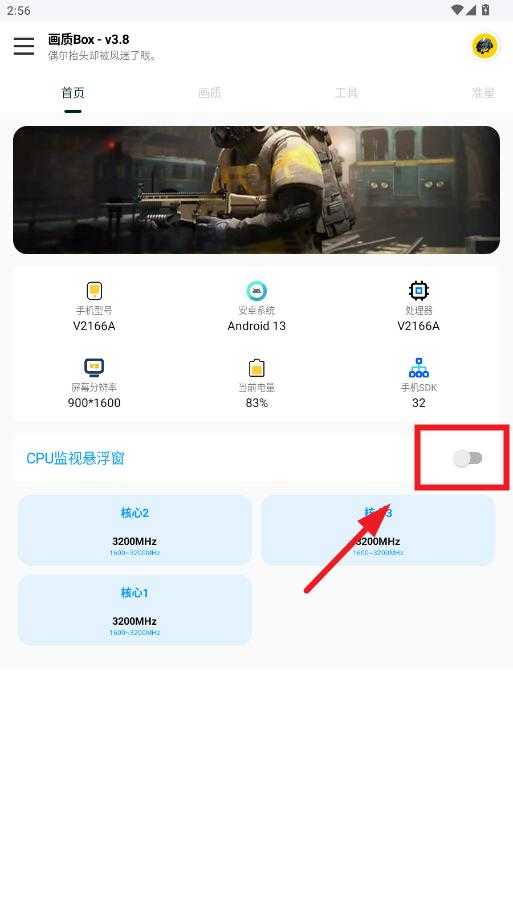 进入主界面后可查看设备信息,包括型号、系统版本、处理器、屏幕分辨率及电量等,还可开启CPU监控悬浮窗功能