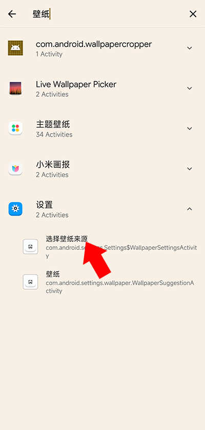 第2步:进入Activities页面后,在搜索栏输入wallpaper”,找到设置-选择壁纸”并点击。如图: