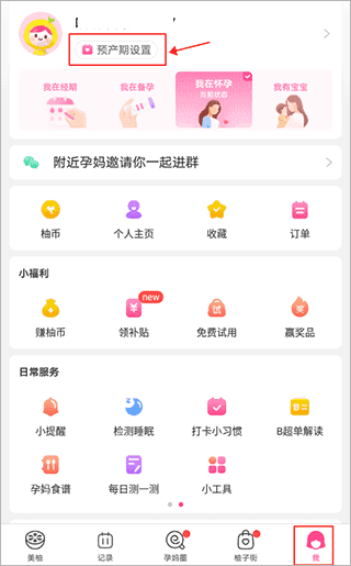 1、打开美柚,在我”的页面中找到预产期”设置