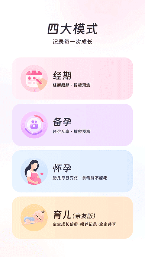 支持切换四大模式:经期、备孕、怀孕、育儿,满足不同人生阶段的需求
