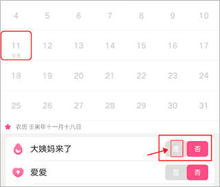 2、在日历中选择新的经期起始日,点击大姨妈来了”按钮并确认是”。