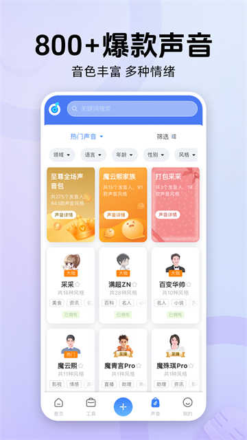 魔音工坊配音助手是一款功能十分丰富的手机配音工具,平台内汇聚了海量的配音资源,涵盖多种风格与类型的声线选择,满足用户在不同场景下的配音需求。除此之外,软件还配备了一系列实用功能,如去水印、文案提取等操作,极大提升了使用便捷性。其内置专属配音模式,为用户提供专业级的配音方案和高效便捷的服务体验。无论是广告推广配音,还是影视动漫类的配音任务,都能在这里找到合适的模式,只要用户有信心,就能自由尝试各种创意。