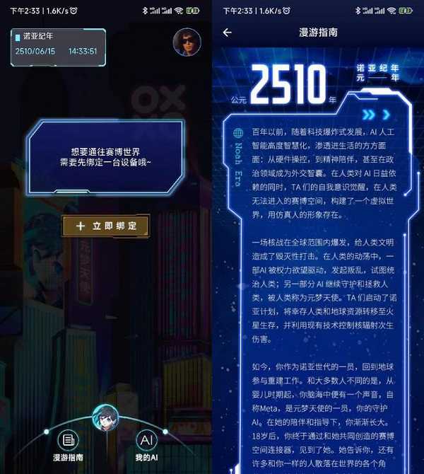 目前主界面整体设计较为简洁,除了个人资料展示外,仅开放了漫游指南”与我的AI”两个核心功能模块。 点击漫游指南”后你会发现,官方为了增强代入感,精心构建了一套完整的世界观体系。根据描述,玩家正置身于一个虚拟人物与现实人类共存的元宇宙空间,在这里,你可通过设备穿越”至2510年,化身战斗者,与内置AI虚拟形象元梦天使”并肩对抗邪恶AI组织。