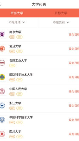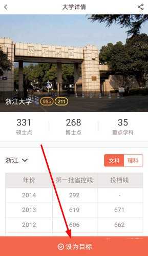 4、选定目标院校后,进入该校详情页,点击设为目标”按钮,即可成功更新目标学校,如图所示: