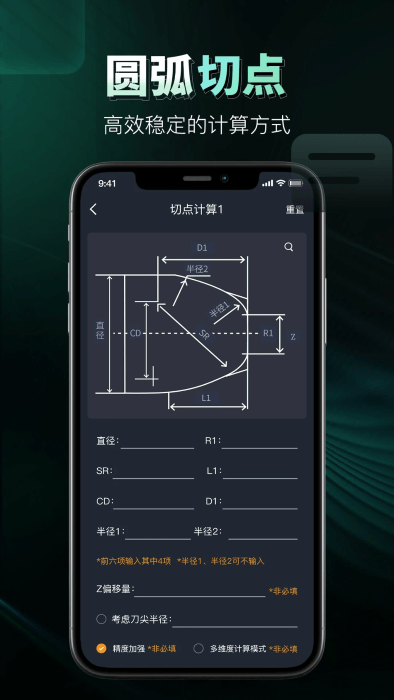 2.直线与圆弧切点计算:包含多种常见零件结构,可快速计算出切点坐标并实时生成程序, 角度接圆弧、圆弧接角度、角度接角度、圆弧接圆弧,同时提供刀尖补偿功能。