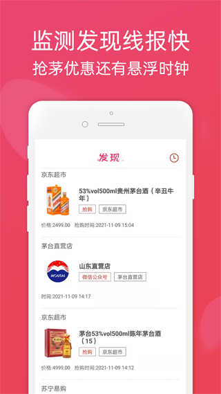 【发现频道】提供茅台自营店放货提醒服务,并同步更新京东、天猫、真快乐等多个平台的上新通知。