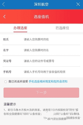 2、在对应航司页面点击【值机选座】,输入姓名、证件号、联系方式后点击下一步。