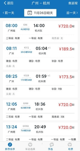 支持按发车时间、到达时间、总行程时长等维度筛选,让订票更智能快捷;