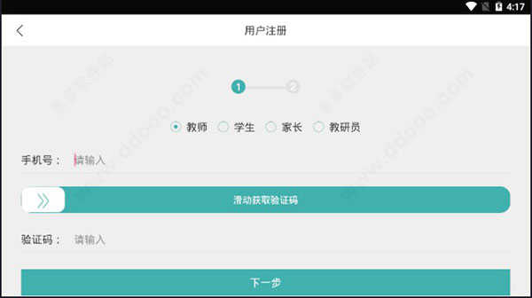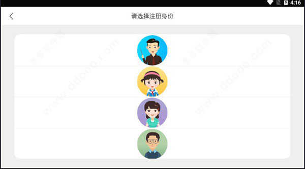 第二步:选择身份类型,包括教师、学生、家长或教研员,并点击对应的图标继续操作;