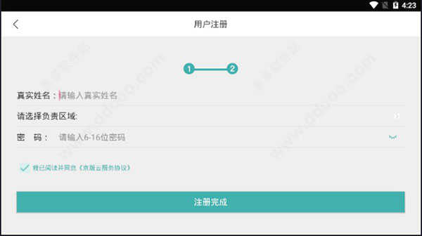 第四步:填写真实姓名、所在地区及密码,确认信息无误后点击注册完成。