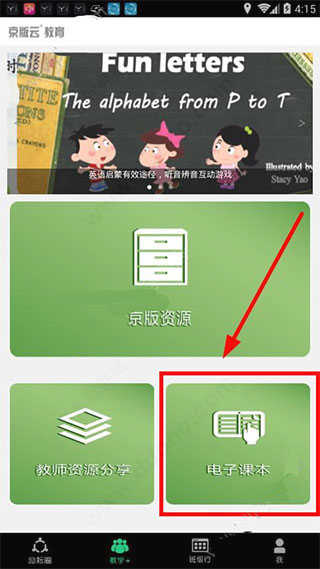 1、进入京版云app首页,切换至教学”页面,点击电子课本”选项;