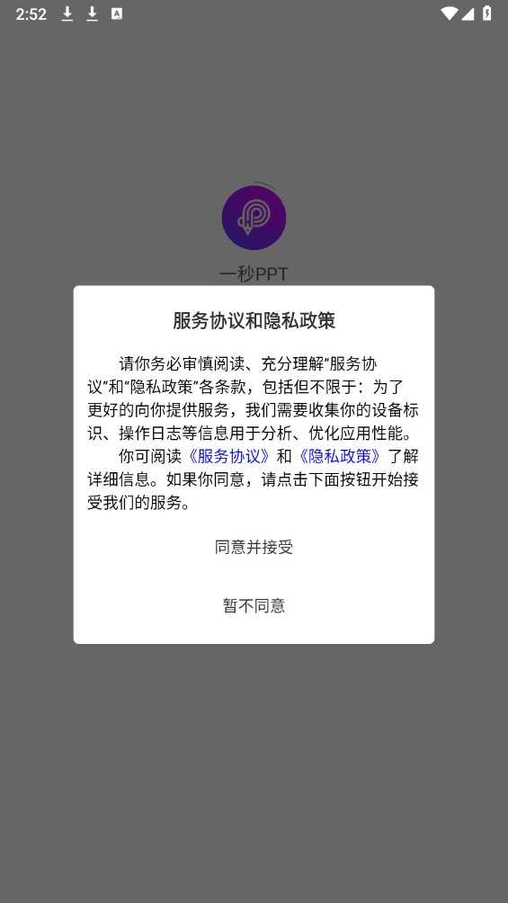 1、下载并安装一秒PPT,在阅读并同意相关协议后启动应用。