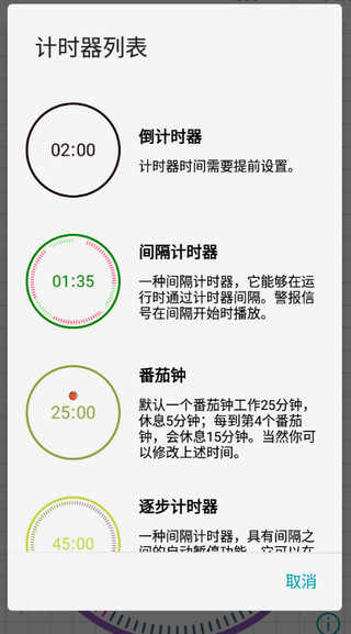 1、提供六种不同类型的计时器,满足多样化需求。