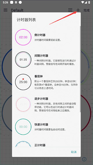 1、添加新的计时器:点击+”号按钮,在弹出的选项中挑选需要的类型添加。