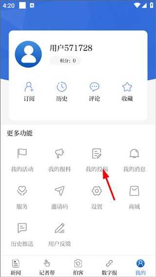 2、在我的”页面中找到更多功能”,选择我的投稿”;