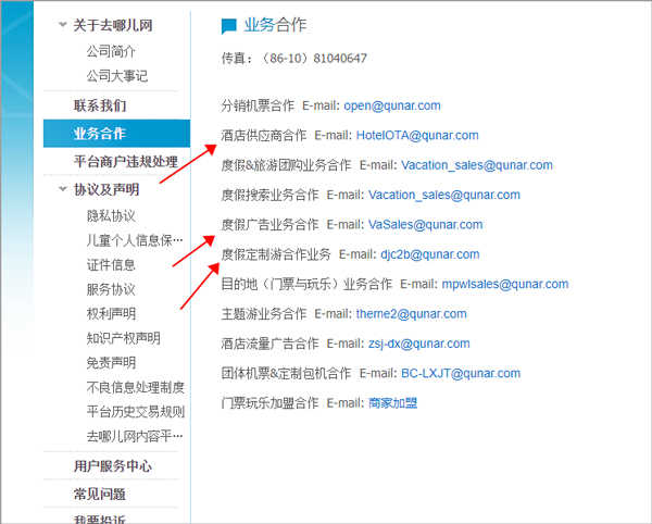 进入合作页面后,会看到多个业务联系邮箱,用户可根据自身需求选择合适的邮箱发送民宿合作意向及相关资料