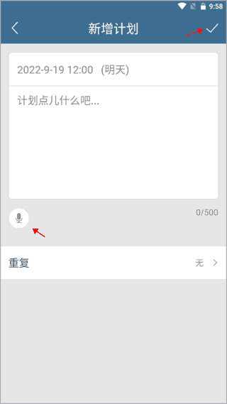 2、通过键盘输入或语音录入的方式填写计划内容,选择是否开启重复提醒,完成后点击右上角√”保存。