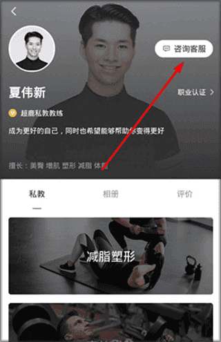 3、最后跳转到私教介绍界面,点击右上方咨询客服”按钮,即可完成预约操作。