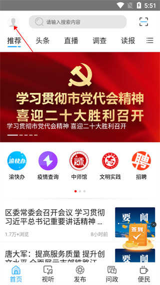 打开最江津app首页,在页面左上方找到并点击【头像图标】。
